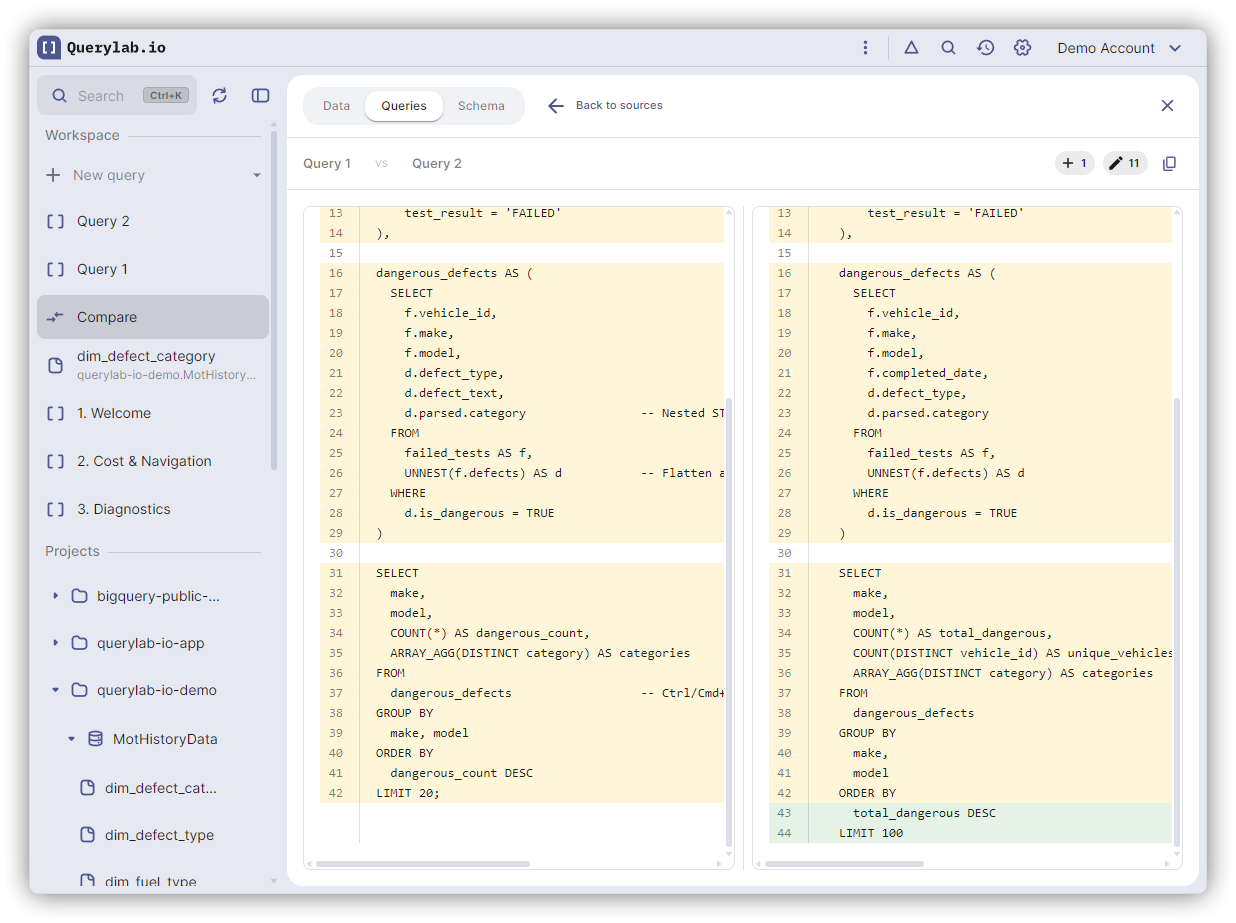 For SQL-based comparisons, Querylab.io shows estimated bytes and cost before running: