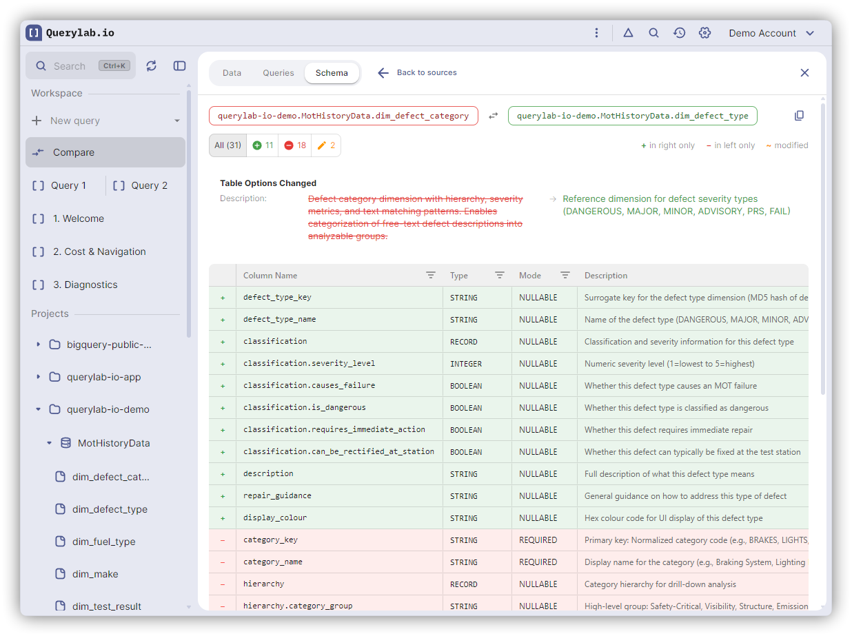 | Schema | Column structure and metadata comparison |