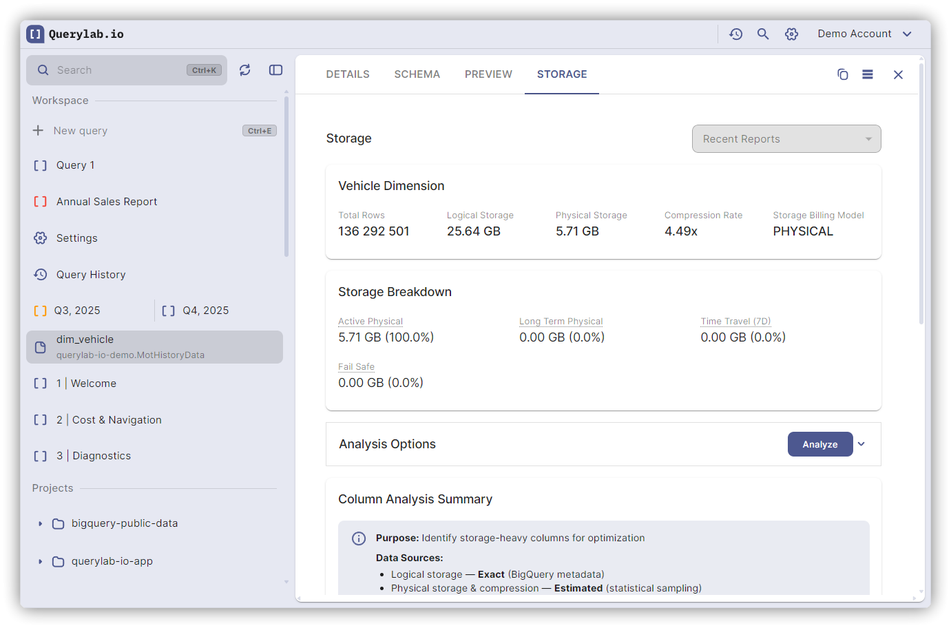 Analyze storage usage and costs at dataset, table, and column level.