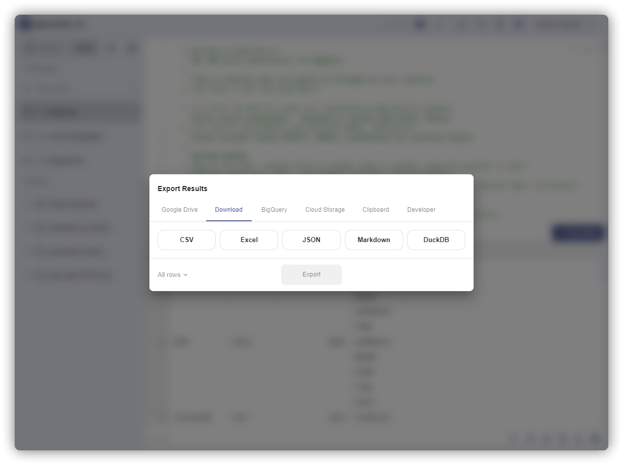 Export query results or entire tables to Google Sheets, CSV, Excel, and more.