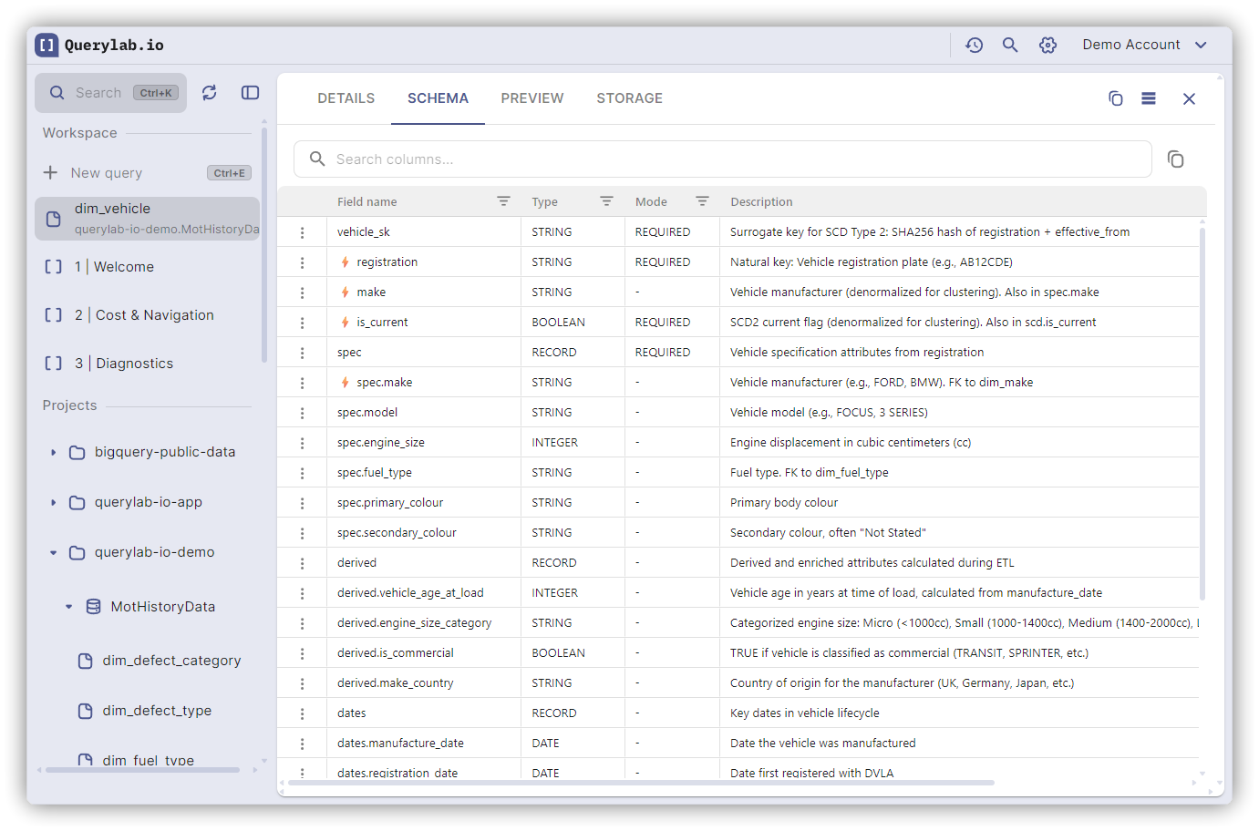 - Type: STRING, INT64, STRUCT, ARRAY, etc.