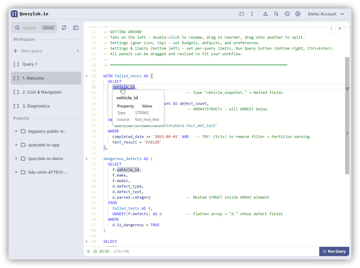 Works with: CTEs, table aliases, column aliases, schema tables/columns