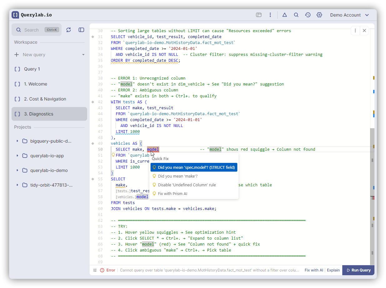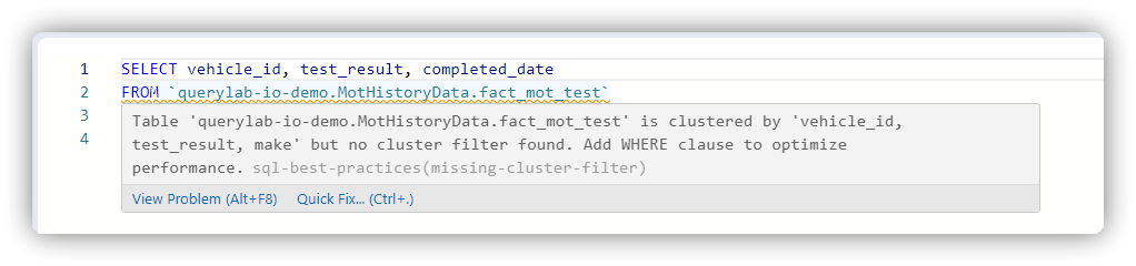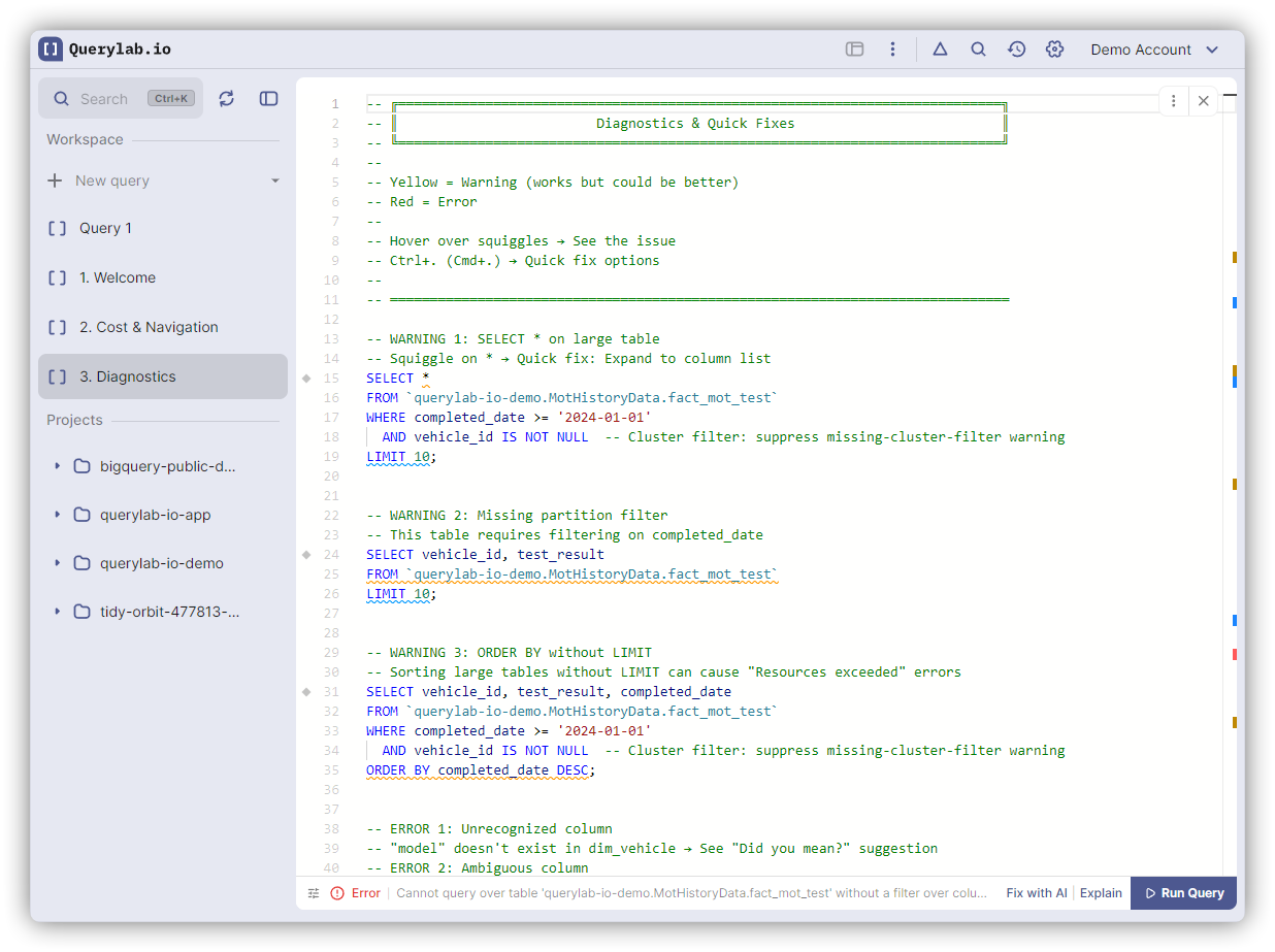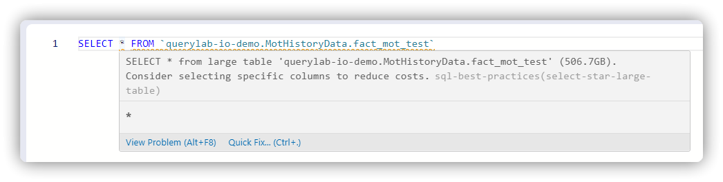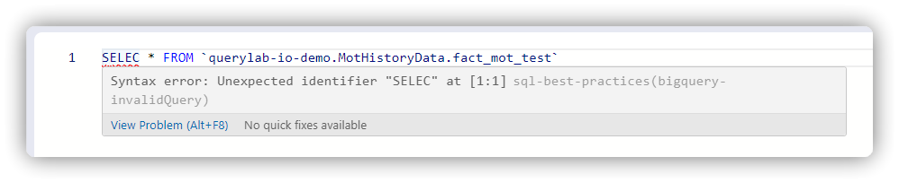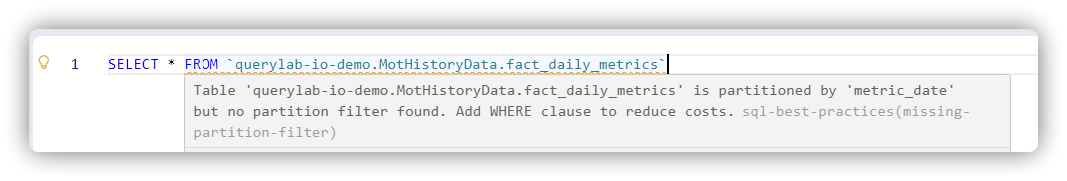 Querylab.io analyzes your SQL in real-time and highlights issues with colored underlines.