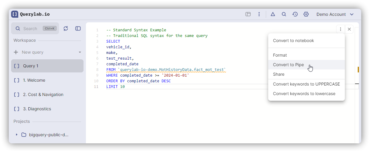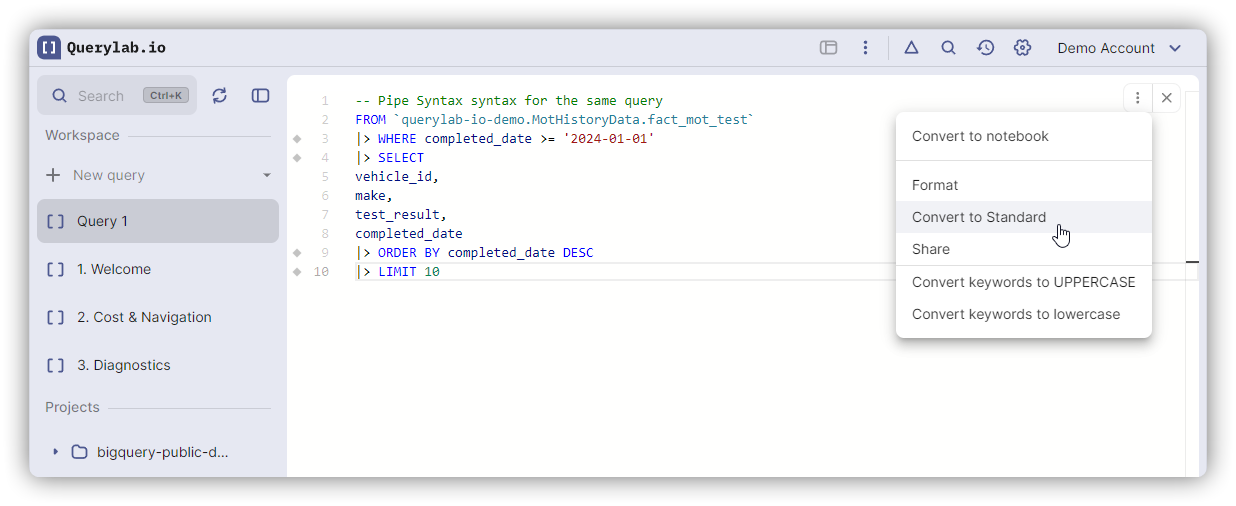Convert between standard SQL and BigQuery's pipe syntax.