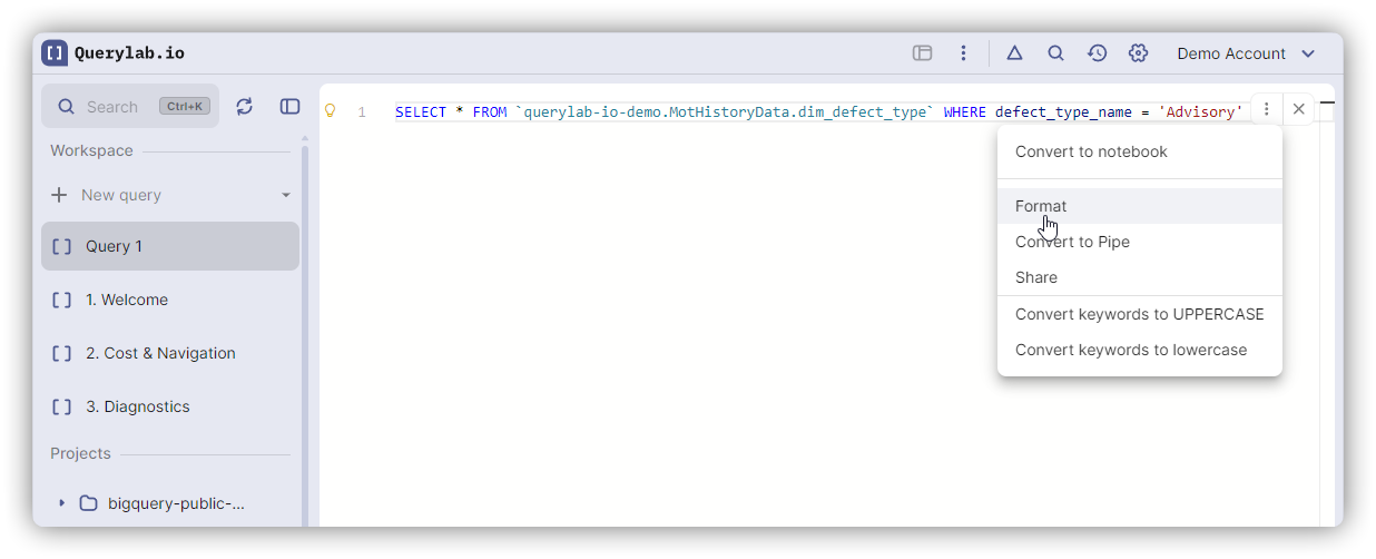 Format your SQL with Cmd+Shift+F (Mac) or Ctrl+Shift+F (Windows/Linux).